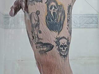 在浴室的公共休闲区,我赤身裸体地撸管我的饥渴鸡巴。